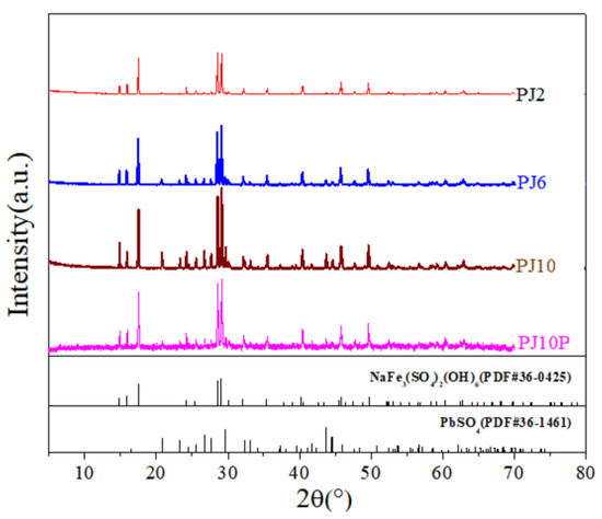 The results of the chemical element analysis of this simulated lead-bearing jarosite, named PJ10, PJ10-P, PJ2, and PJ6, respectively, are shown in Table 2. The results show that the molar ratio of sodium to iron in the simulated jarosite is less than 0.33, which may be attributed to the substitution of lead for part of sodium leading to the formation of Pb-containing jarosite. The Pb content of PJ10 synthesized using Pb(CH3COO)2 as the lead source is consistent with the theoretical value, while the Pb content of PJ10-P synthesized using PbSO4 is lower than the theoretical value. This may be due to the fact that PbSO4 is added in the solid form and the fact that only part of it can participate in the precipitation process of jarosite. The uneven distribution of Pb in PJ10-P resulted in a lower Pb content.