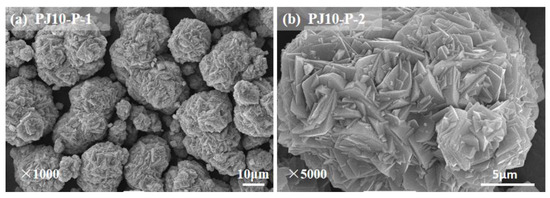 SEM images of PJ10-P. (a) Mag. 10,000× and (b) Mag. 5000×.