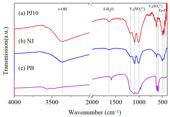 The infrared spectrum of PJ10 is given in Figure 10, comparing both sodium jarosite (NJ) and lead sulfate (PB) to gain further insight into the structural features of PJ10; data analysis was performed according to the results and relevant manuals [38,39,40]. The spectrum shows that the stretching vibration peak at 3360 cm−1 is attributed to v-OH, while the peak at 1636 cm−1 corresponds to the stretching vibration of HOH caused by water molecule deformation. Additionally, peaks at 1190 cm−1, 1100 cm−1, and 1000 cm−1 are identified as stretching vibration peaks of v3(SO4), indicating the presence of sodium jarosite and a lead sulfate structure. Furthermore, peaks at 629 cm−1 and 597 cm−1 are assigned with v4(SO4) stretching vibrations, consistent with the characteristic peaks of sodium jarosite and lead sulfate. This confirms the existence of jarosite and lead sulfate in PJ10. Moreover, peaks at 473 cm−1 and 507 cm−1 are indicative of the octahedral structure of FeO6, characteristic of jarosite.