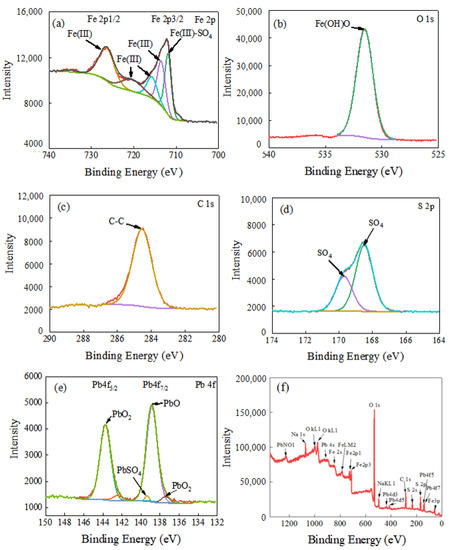 The full spectrum (Figure 11f) reveals that the PJ10 predominantly consists of O, Pb, Fe, S, Na, and other elements. Among them, Fe2p, O1s, C1s, S2p, and Pb4f were subjected to peak fitting to determine their valence state and possible chemical forms.