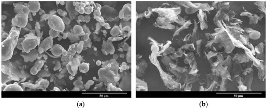 Figure 1. SEM images: (a) aluminum powder with a chemical purity of 99.5% and an average particle size of 37 µm.; (b) graphene nanoplatelets with a thickness of 6–8 nm and a purity of 99.5%.