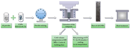 The scheme of the production process of the Al/GNP nanocomposites is illustrated in Figure 3.