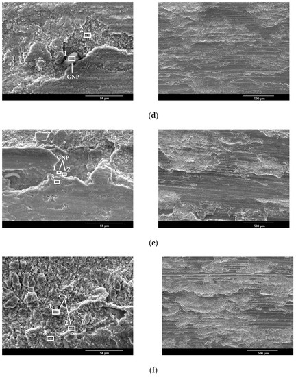 SEM images of the worn surfaces with numbers indicating each zone of the EDS analysis (a) Al with 0.1 wt.% GNPs (left image ×1000; right image ×80); (b) Al with 0.5 wt.% GNPs (left image ×1000; right image ×80); (c) Al with 1.1 wt.% GNPs (left image ×1000; right image ×80); (d) annealed Al with 0.1 wt.% GNPs and Al4C3 (left image ×1000; right image ×80); (e) annealed Al with 0.5 wt.% GNPs and Al4C3 (left image ×1000; right image ×80); (f) annealed Al with 1.1 wt.% GNPs and Al4C3 (left image ×1000; right image ×80).
