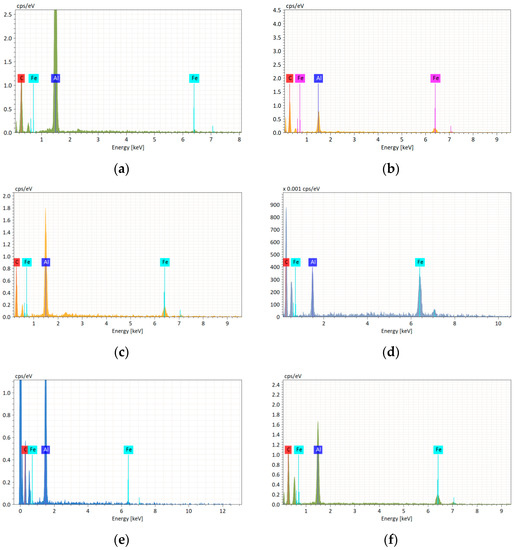 Figure 4a–f presents the SEM images of the test specimen after the pin-on-disk tests, with the distinct zones indicated by the markers. These images were captured following the wear experiments conducted under the following conditions: a linear speed of 0.9 m/s, a sliding distance of 540 m and a load of 30 N. The results of the EDS analysis are shown in Table 1, Table 2, Table 3, Table 4, Table 5 and Table 6 and Figure 5a–f.