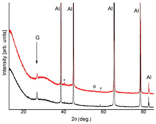 XRD pattern of the sample containing 1.1 wt.% GNPs before (black curve) and after (red curve) the HT. The peaks of aluminum, graphene and the amorphous phase are labeled as Al and G. The peak of graphene corresponds to the (002) plane. The asterisks (*) denote the beta lines of aluminum. The small peak at 54° 2θ in the HT sample is a probable trace peak of Al4C3 (o). Adapted from [16].