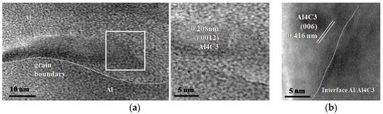 The HRTEM analyses provided the strongest evidence for the formation of nanosized A4C3 after the HT. Figure 7a shows a crystalline carbide particle (approximately 50 nm in longitude and about 7 nm in diameter) located at the grain boundary of the matrix. The observed carbide corresponded to COD #96-154-0875 (c = 2.498000 nm). The registered plane was (0012) with an interplanar distance of 0.208 nm. It was suggested that the graphene fully reacted with the aluminum to produce the carbide, since there was no evidence of the presence of graphene. Figure 7b shows the Fourier filtered image of the clear interface of the well bonded to the Al matrix Al4C3 carbide. The measured interplanar distance here was 0.416 nm, corresponding to the plane (006) of the carbide.