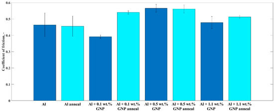 - The results showed that the addition of GNPs to aluminum-based nanocomposites increased the coefficient of friction (CF) by approximately 44% when comparing 0.1 wt.% GNP to 0.5 wt.% GNP. However, the CF decreased by 15% when the GNPs concentration increased to 1.1 wt.%. The optimal concentration of GNPs for minimizing the CF of Al-based nanocomposites was 0.1 wt.%.