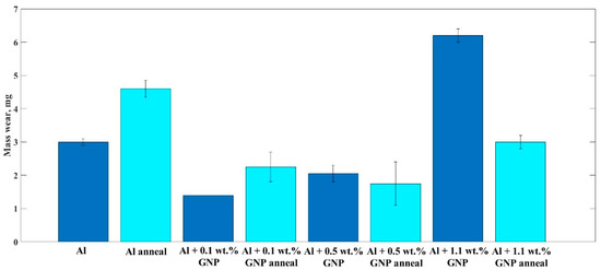 Mass wear of Al with GNPs (0–1.1 wt.%) and the annealed Al with GNPs (0–1.1 wt.%) and Al4C3 at a 30 N load, 0.9 m∙s−1 sliding speed and 540 m sliding distance under dry sliding friction conditions at room temperature.