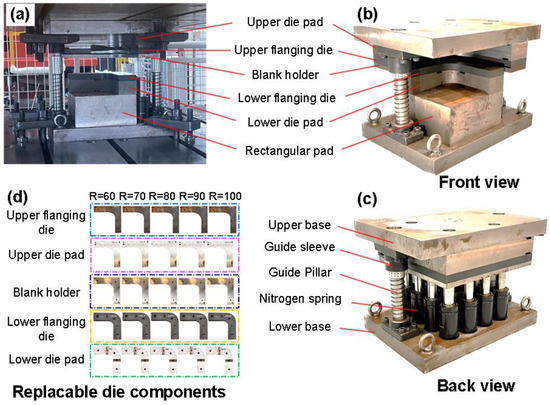 Parts which are flanged after cutting are widely used in automobile components, such as doors, hood, trunk lid, roof, and chassis. Therefore, flanging tests of cut specimens were conducted. A set of flanging tools was self-designed to realize flanging tests on the SHPH27-200-type servo hydraulic press, as shown in Figure 2. The used tool is mainly composed of an upper flanging die, lower flanging die, blank holder, upper die pad, and lower die pad (Figure 2a,b). The guiding components including a guide sleeve and guide pillar were designed to control the testing direction, and nitrogen springs were added to provide the supporting force to the blank holder (Figure 2c). The upper/lower flanging dies and upper/lower die pads were replaceable in order to adjust the flanging parameters, as shown in Figure 2d.