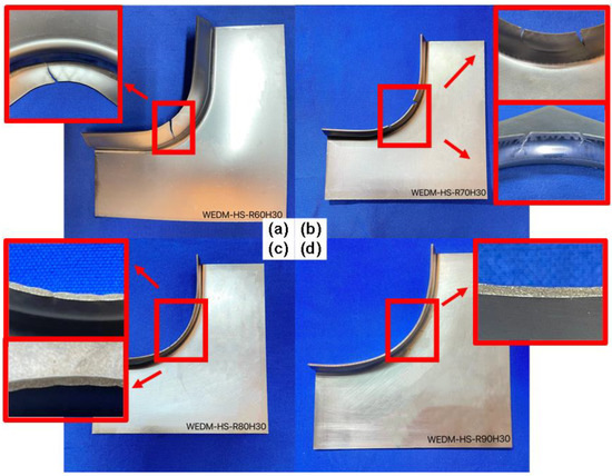 Cut edges after flanging under H30 and different R values of the WEDM-HS process. (a) R60H30; (b) R70H30; (c) R80H30; (d) R90H30.