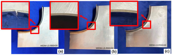 The WEDM process was conducted at a low speed in another working condition, namely WEDM-LS; the flanging results are shown in Table 2. The trends in formability dependent on R and H values are the same as those under WEDM-HS in Table 1. In contrast with the critical condition of R70H30 under WEDM-HS, R80H30 is the critical condition of cracking under WEDM-LS. The flanged specimens with R and H values around the critical condition are shown in Figure 5. When R is 80 mm (Figure 5a), the cut edge significantly cracks. Under the condition of R90 or R100 (Figure 5b,c), no cracks are found and the cutting–flanging process is successful.