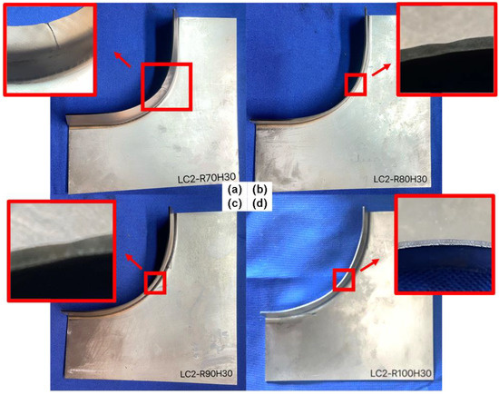 By contrast, at high power and high speed, as listed in Table 4, the critical condition of material cracking is also R70H30. Images of cut edges after flanging under H30 and R70-R100 of the LC-H process are shown in Figure 7. The cut-edge crack can be observed under R70H30. When R is equal to 80 mm or 90 mm, the necking phenomenon can be found, while the necking degree under R90 is smaller than that under R80. This means that a larger flanging radius can contribute to a relatively better formability, even if their flanging results are both in a necking state. In general, compared with the LC-L process, the high speed and high power of the LC-H process can easily cause local damage and local large deformation on the cut edge and reduce the formability.