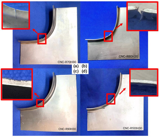 The flanging results under the CNC-milling process are shown in Table 6. The changing trend of formability dependent on R and H values is the same as that under the WEDM process in Section 3.1.1. R80H30 is the critical condition for material cracking. With an increase in R value and a decrease in H value, the formability of flanged specimen becomes better; conversely, with a decrease in R value and an increase in H value, the formability becomes worse. Under the condition of H30, specimens of R70, R80, R90, and R100 are shown in Figure 9. With an increase in flanging radius R from R70 to R100, the material exhibits a trend from cracking, necking, to successful flanging, as shown in Figure 9a,d.