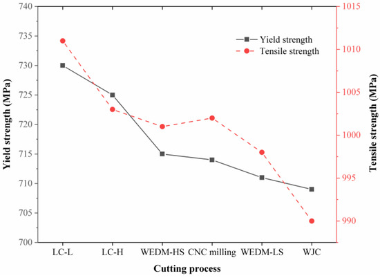 Uniaxial tensile test was carried out on the samples treated by six kinds of cutting processes, respectively, and the engineering stress–engineering strain curves under different cutting processes were obtained. In order to specifically measure the formability gap between specimens, the yield strength and tensile strength of materials were calculated for comparison, as shown in Figure 10. As can be seen from Figure 10, different cut-edge damage conditions have an impact on the yield strength and tensile strength of the materials. The yield strength of the materials after the LC-L and LC-H processes reaches 730 MPa and 725 MPa, respectively, which is significantly improved compared with the other four processes. The yield strengths of the other four processes are about 710 MPa, and that of WJC is the lowest. The tensile strength of LC-L reaches 1011 MPa, and that of WJC is only 990 MPa, which means that WJC will seriously affect the basic mechanical properties of the cut edge. There is little difference in yield strength and tensile strength between WEDM and CNC milling. The specific influential mechanism of the cutting process on tensile properties is studied in the following section with microstructural observation.
