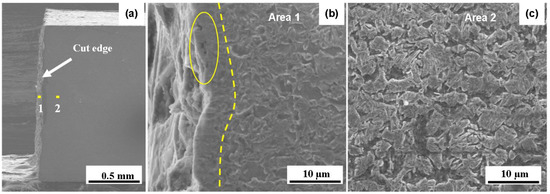An SEM image of a cut edge after the WEDM-HS process is shown in Figure 11a. The surface of the cut edge is relatively straight and smooth, and the thickness of the plate is also retained. Two areas, denoted as Area 1 on the surface and Area 2 in the matrix, were selected along the central line for further observation. Area 1 was used to observe the effect of the cut edge, and Area 2 was selected to observe the matrix microstructure. SEM images at Area 1 and Area 2 are shown in Figure 11b,c. Certain obvious regions of local micro-damage can be seen in Figure 11b to form microvoids on the surface of the edge as a result of the influence of the electrical discharge of the wire. Comparing the microstructure near the sub-surface in Figure 11b and the matrix in Figure 11c, the depth of the affected zone of WEDM-HS can be determined as about 3 μm, which means the affected zone of cutting is small.