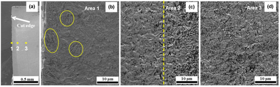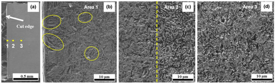 SEM images under the LC-L and LC-H processes are shown in Figure 13 and Figure 14. For the LC-L process, it can be seen in Figure 13a that the edges of the material are flat and smooth after laser cutting with a low speed and low power. Three areas, namely Areas 1, 2, and 3 from the surface to the matrix along the central line, were selected for further observation, as shown in Figure 13b,d. No micro-damage and no microvoids were seen on the surface of the edge (Figure 13b). Acicular martensite could be found near the sub-surface, which was generated by laser heating and subsequent cooling. In Figure 13c, a clear boundary line appears, which can be used to distinguish the heat-affected zone. As a result, the depth of the HAZ of LC-L is about 150 μm. By comparison, for the LC-H process, a similar microstructure to that of LC-L is displayed from the surface to the matrix, as shown in Figure 14a,d. The acicular martensite also appears near the sub-surface and the depth of the affected zone of LC-H is also about 150 μm. The results indicate that the microstructure of the cut edge is similar for the LC-L and LC-H processes.