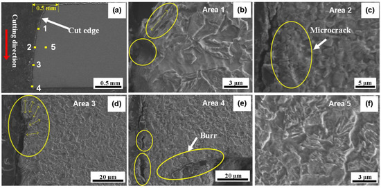 SEM images of cut edges under the WJC process. (a) Overall morphology of cut edge; (b) Area 1; (c) Area 2; (d) Area 3; (e) Area 4; (f) Area 5.