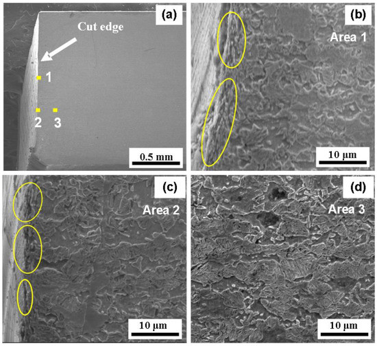SEM images under the CNC-milling process are shown in Figure 16. It can be seen that the cut edge after CNC milling is flat and smooth, as shown in Figure 16a, and the thickness of the plate is well retained. Three areas were selected for further observation. In Figure 16b–d of the surface of the edge, the plastic deformation only occurs on the surface layer with a small depth. The sub-surface layer keeps the same microstructure as the matrix (Figure 16d). In general, the influence of the cutting on the material is small.