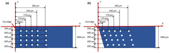 Design of microhardness measurement points for the cases of the straight and oblique cut edges. (a) Straight cut edge; (b) oblique cut edge.
