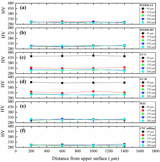 In addition, according to the results of the microhardness test, the hardened layer of the edge for the LC processes was about 150 μm. For the other four processes, namely WEDM-HS, WEDM-LS, WJC, and CNC milling, the hardened layer was less than 50 μm. As shown in SEM images, the cut-affected zone was about 3 μm for WEDM and 2 μm for CNC milling. The analysis of the microstructure is consistent with the conclusions regarding microhardness.