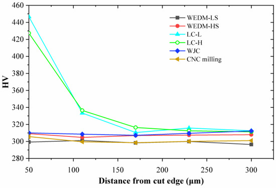 Microhardness values of measurement points under different cutting processes, namely WEDM-LS, WEDM-HS, LC-L, LC-H, WJC, and CNC milling, are shown in Figure 18. It can be seen that the microhardness values are basically consistent at the same depth under the same process, and therefore the average microhardness value of four sampling points at the same depth can be calculated as the microhardness value corresponding to the depth. Thus, the obtained microhardness distributions at different distances from the cut edge are shown in Figure 19. The microhardness values after laser cutting (LC-H and LC-L) are significantly enhanced, and the hardened depth is about 150 μm. The edge microhardness is 446 HV for LC-L and 427 HV for LC-H, respectively. From the cut edge, the microhardness values gradually decrease to the matrix microhardness value of about 300 HV. For the WJC, CNC milling, and WEDM processes, the microhardness value remains at about 300 HV from the edge to the matrix, which means their hardened layers are thin (<50 μm). The microhardness distribution results match the microstructure results in Section 3.3 well.
