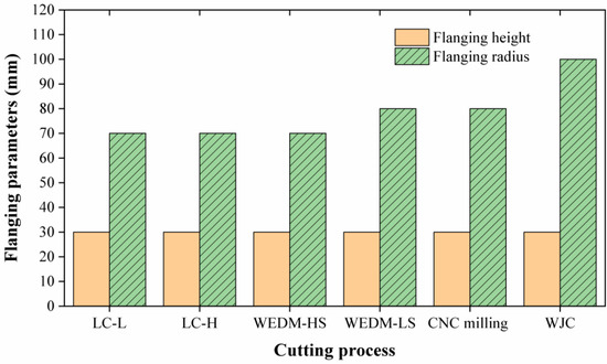 Different cutting processes have a significant influence on the flanging test. The critical conditions of flanging edge cracking under different cutting processes are compared in Figure 20. Under each process, the critical flanging heights are the same at 30 mm. However, the critical flanging radii are obviously different. A rising trend is displayed from the LC-L, LC-H, WEDM-HS, WEDM-LS, CNC milling, and WJC. The critical flanging radius value is changed from 70 mm to 100 mm.