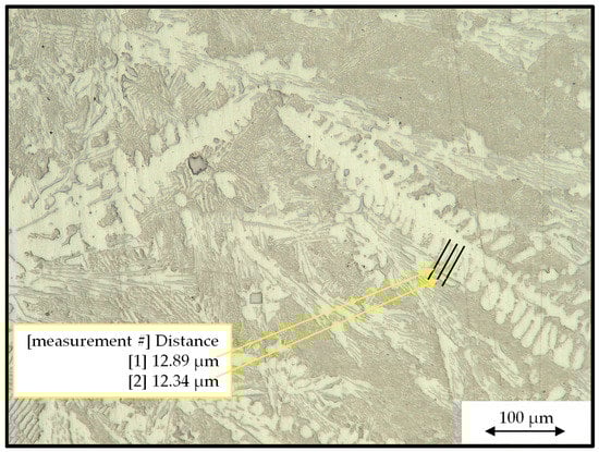 Once the samples were prepared, optical microscopy was performed to measure the secondary dendrite arm spacing (SDAS). SDAS measurements were taken with a VHX-7000 series digital microscope (KEYENCE, Mississauga, ON, Canada) according to method E outlined in [28], which involved measuring between two secondary dendrites parallel to the primary arm. A minimum of 50 measurements were taken for each sample to ensure measurement and standard deviation accuracy. An example of these measurements is shown in Figure 2.