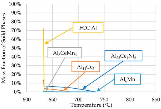 The phase evolutions shown in Figure 8 are consistent with the SEM micrographs and DSC data. The only discrepancy is that small amounts of Al6Mn precipitated close to the end of Scheil solidification in all the samples. However, SEM/EDS showed no presence of Al6Mn in the casting. As mentioned, ThermoCalcTM did not account for the precipitation of Al10CeMn2 and Al20CeMn2. Instead, the software predicted the Al8CeMn4 phase to precipitate, which was disproved by the EDS data in Table 2.