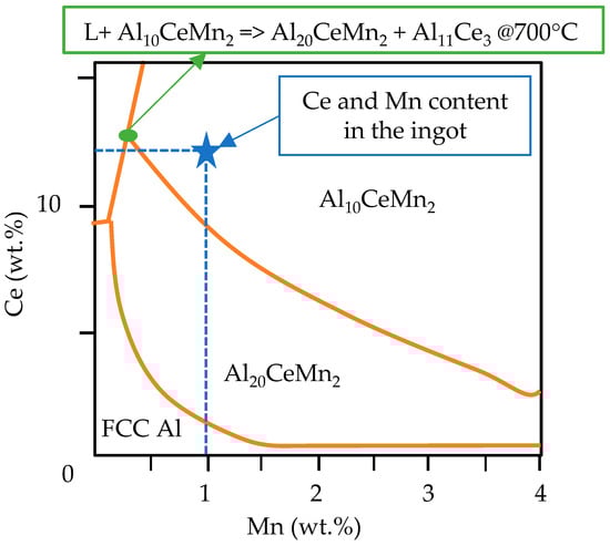 In the preliminary analysis [10], when investigating the interplay between the cooling rate, microstructure, and tensile properties of the current Al-Ce-Ni-Mn alloy, it was found that Al8CeMn4 was absent from the casting. Instead, it was replaced by Al10CeMn2 and Al20CeMn2. Over the past few years, research has been conducted on Al-Ce-Mn alloys, which has focused on the Al-rich portion of this system [34,35,36]. Most significant to the solidification kinetics of the Al-Ce-Ni-Mn alloy described in the current study is the revised portion of the Al-rich corner of the Al-Ce-Mn ternary diagram performed by Yang et al. in [34]. This revised portion of the ternary diagram shows that the Al10CeMn2 and Al20CeMn2 phases dominated earlier during solidification, with the latter phase having a slightly higher thermodynamic driving force. From this revised ternary diagram, it is expected, that for the composition of the alloy under investigation (12.37% Ce, 0.94% Mn), the Al10CeMn2 phase would form earlier during solidification, after which, at ~700 °C, the ternary Al-Ce-Mn phase would transition to Al20CeMn2 and Al11Ce3. This phenomenon is shown below in Figure 4.