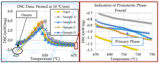 Figure 6 shows that all samples provided a similar solidus temperature (onset) to the 632 °C predicted by the Scheil simulation of the ingot material in ThermoCalcTM, except for that of Sample B, which was 5 °C lower [26]. The discrepancy in eutectic temperatures between Sample B and the ingot suggested a compositional variance in the center of the wedge mold (Zone 2). Additionally, the exploded view in Figure 6, on the right, shows evidence of primary formation in samples B, C, and D at different temperatures, suggesting compositional variations between the DSC samples. These results are consistent with the SEM micrographs.