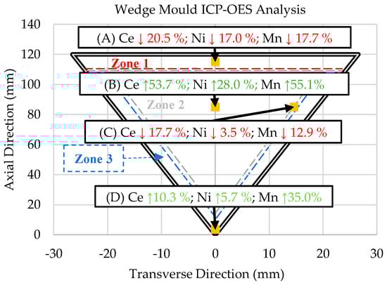 ICP-OES analysis was performed to characterize the composition gradient that directly resulted from the solidification kinetics of the Al-Ce-Ni-Mn alloy and the directional solidification induced by the wedge mold casting configuration. The results of the ICP-OES experiments are shown in Figure 6. In Figure 6, the downward-pointing arrows highlighted in red indicate the elemental percentage of change compared with the original ingot’s composition shown in Table 1. The green upward-pointing arrows indicate increases in elemental composition based on the original ingot values.