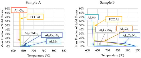 The Scheil simulation for each sample revealed that Sample A contained proeutectic Al23Ce4Ni6 starting to precipitate at 682 °C. The software predicted 3.8 wt.% (<1 vol.%) of the primary A23Ce4Ni6 phase, which was consistent with the SEM micrographs. The relatively low amount of the primary phase, coupled with the precipitation temperature being close to the eutectic temperature, explains why the phase did not register in the DSC results. It is likely that, during DSC experimentation, the proeutectic formation of the Al23Ce4Ni6 phase was encapsulated in the characteristic peak. Therefore, the end temperature of the characteristic peak (655 °C) from the DSC results for sample A was likely the liquidus temperature of the sample. This value was lower than the Scheil-predicted value of 682 °C. The disagreement between liquidus temperatures was likely because the mass fraction of the primary phases was not significant enough for the DSC to detect the resulting reaction energy. The DSC and Scheil simulation agreed that the solidus temperature of sample A was 632 °C.