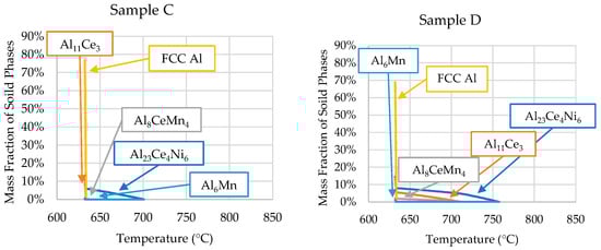 Sample C showed good agreement in the solidus and liquidus temperatures between the Scheil simulation and DSC results, as shown in Table 4. As sample C had a composition closely resembling the ingot composition, the formation of the primary phases was presented in the DSC results. Therefore, the liquidus temperature (700 °C) could be extracted from the DSC results.