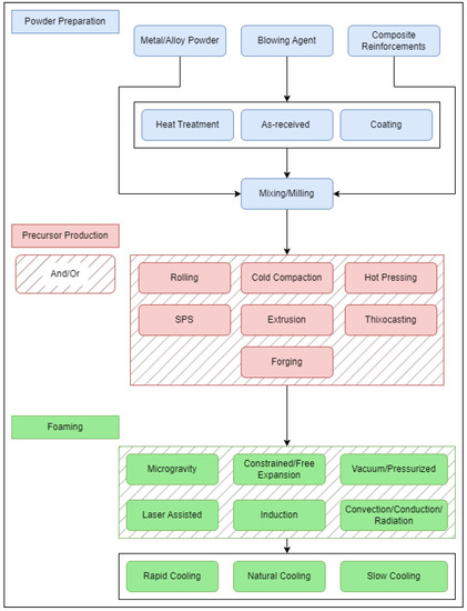 As mentioned, the PCMFP starts with all constituents in powder form. This includes the metal from which the foam is to be made (sometimes referred to as the matrix), and the gas-releasing blowing agent (typically titanium hydride [45] or calcium carbonate [46]). In PCMFP, the powder constituents are simply mixed, followed by compaction to produce what is known as a bulk foamable precursor, which is subsequently foamed above the melting point of the metal or alloy. The bulk foamable precursor has a stringent requirement of needing to be almost fully dense, with a density typically 99% of theoretical being optimal. It is important to note that, as with powder metallurgy, several basic process parameters will play a role in PCMFP. These include the powder particle size of the metal/alloy, blowing agent, and composite reinforcement (if producing metal matrix composite foams), as well as powder content, powder chemistry, powder strength, and processing environment. The strength of the metal or alloy powder, although not an obvious one at first, has a major impact on the powder compaction stage (foamable precursor production), as discussed later. This leaves some challenges for high-strength powders (e.g., alloy powders), which would otherwise be difficult to press to high densities at room temperature. Figure 2 is a flow chart of the general process with some of its potential sequence variations. Under powder preparation, the primary powder constituents are the metal or alloy composition powder and blowing agent (sometimes referred to as foaming agent) powder. For metallic composites, ceramic reinforcements are also added. The blowing agent powder can be added to the other powders either in an as-received condition, or after it has been heat-treated (or coated). All powders are then either mixed or milled, or a combination of both, and then consolidated to produce the high-density bulk foamable precursor. Some of these consolidation processes can take place either separately or in combination with one another. For example, the mixed powders could be directly spark-plasma-sintered (SPS), or cold-compacted followed by hot extrusion. Finally, the foaming process can take place in a variety of ways, including in an electrically resistive furnace [47], induction heater [48], using laser heating [49], in a furnace equipped with halogen lamps (with infrared reflectors [30]), etc. This is followed by cooling under different conditions. Some work has also investigated post-foaming heat treatments [28,50,51], which can affect the mechanical behavior of the final foam.