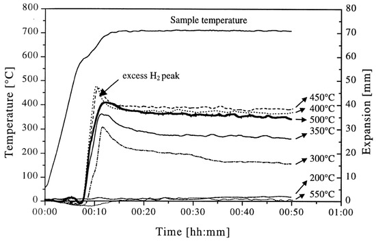 The environment can also influence the gas release temperatures, as seen in Table 2 for TiH2 (<63 µm). The gas release onset temperature in all three environments (air, He, and vacuum) are about the same; however, there is a difference in the peak gas (hydrogen) release temperatures, which increases from vacuum to helium to air, due to the relative increase in oxygen concentration. Although the He gas used was of very high purity, the unoptimized tubing was believed to have introduced some air, leaving He with an intermediate peak onset temperature [64].