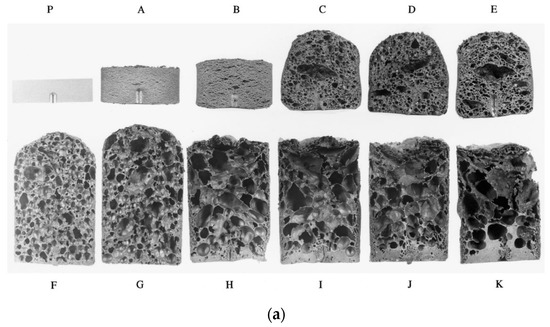 As mentioned, in addition to pure aluminum [84,105], a large number of Al alloys have been investigated in PCMFP, including AlSi6 [109], AlSi7 [64], AlSi9 [43], AlSi10 [90], AlSi12 [111], AlSi9.6Mg1 [112], Al6061 (0.4–0.8 Si, 0.8–1.2 Mg, and <0.7 Fe) [82], AlSi11Cu4Zn2 [113] (a quaternary alloy). The ternary alloy AlSi8Mg4 was found to result in good expansion and fine/uniform pore sizes and structures, as seen in Figure 7 [109]. This successful AlSi8Mg4 alloy was not only patented but has also found commercial application [43,114]. Further investigations into the AlSi8Mg4 alloy revealed that an island of compositions around this alloy exists, where good foaming is still possible [114]. It was found that increasing the Si and decreasing Mg results in better expansion. Moreover, a correlation was found between a certain liquid fraction range (40–60%) just above the solidus temperature and increased expansion. As an outcome of this comprehensive study, AlSiMg3 was found to have the highest expansion with an acceptable structure of the foam, while AlSi9Mg5 provided the best structure of the pores and an expansion that is acceptable. It was concluded that AlSi8Mg4 provided a good compromise between the two compositions.