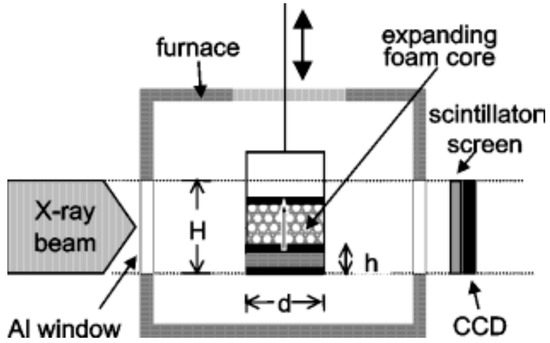 To gain an understanding of the foaming behavior of metals, some researchers studied the expansion behavior of foamable precursors during the foaming process, using devices such as an expandometer [47,82] or optical expandometer [90]. Such approaches are valuable; however, they do not reveal much regarding internal features developed inside the foam, or dynamic mechanisms. There are two fundamental approaches for studying the pore evolution mechanisms in foaming: ex-situ and in-situ. In ex-situ approaches, typically, the foaming process is interrupted at various stages of foaming, followed by characterization of the solidified foam (using, for example, microscopy), to arrive at some sort of understanding of the mechanisms regarding bubble/pore evolution. Since this approach requires multiple samples interrupted at various times during foaming, it introduces some experimental uncertainty. Figure 4a shows the development of the foam structure, while Figure 4b identifies the stages in the expansion curve produced using an expandometer [82]. Although such approaches are useful, a more insightful approach would be the use of in-situ characterization tools. Since molten aluminum is opaque, it was historically a challenge to gain any sort of understanding of the internal mechanisms during foaming. However, a highly significant breakthrough in understanding real-time foaming events was realized by Banhart and co-workers who initially conducted X-ray radioscopy (the experimental setup is described in detail in [97]) investigations to generate 2D time-resolved images [98] during foaming. Figure 5 shows a schematic of the experimental setup [24]. More recently, they applied X-ray tomoscopy [41], which provides 3D time-resolved images (experimental setup is described in [99]). A significant number of important findings were uncovered through these breakthrough approaches, some of which are discussed below.