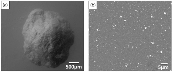 The process of mechanical milling is extremely versatile, in producing powders of varying designs and internal structures. Once used to produce oxide dispersion strengthened alloys [145], the process has recently been used [70,146] to disperse TiH2 particles inside aluminum powders, to produce Al-TiH2 composite particles. These particles can now be considered as foamable precursors in “particle” form as opposed to the conventional bulk form. The approach may have advantages in cladding applications, the ability to selectively foam parts of a component, additive manufacturing, the production of micro-scale foams, or even allowing foaming to take place at lower relative densities of bulk foamable precursors, since the TiH2 is already encapsulated in the aluminum particles. Figure 11a,b shows a macro-scale foamable precursor “particle” and its cross-section, showing the dispersed TiH2 particles. The size of TiH2 particles is smaller than the as-received particle size, due to fracture processes during the mechanical milling process, leading to TiH2 particle size reduction. The process was also applied using a process control agent during mechanical milling to produce micro-scale foamable precursor particles [146]. Figure 12a,b, shows two particles before and after unrestricted foaming in air; as can be seen, the uneven foaming shape is due to breaks in the oxide surface layer allowing outwards expansion (protrusions) to take place preferably there, leading to irregular foamed particles.