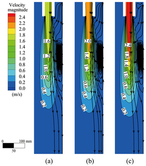 Flow field on the symmetrical plane of the mold at different casting speeds. (a) 5.0 m/min; (b) 6.0 m/min; (c) 7.0 m/min.