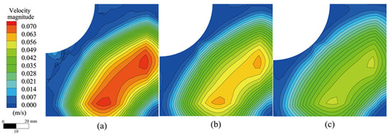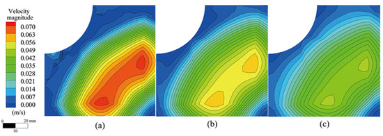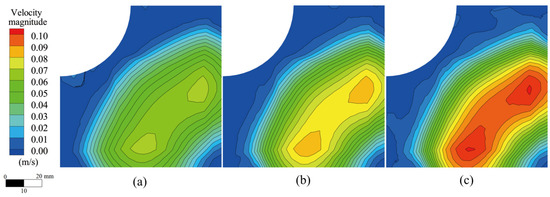 Flow field on the symmetrical plane of the mold at different inner diameters. (a) 40 mm; (b) 45 mm; (c) 50 mm.