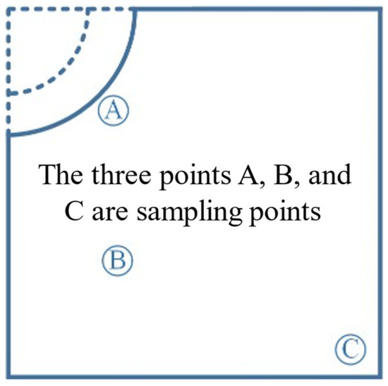 The molten steel’s behavior varied from position to position at the liquid level. Generally, the molten steel’s activity at the center of the liquid level was much faster than at the corner of the mold. Turbulence kinetic energy and liquid level fluctuation were critical indexes of level stability. Three typical data sampling points were selected at the liquid level, according to the simulation results, to analyze the molten steel behavior at the mold’s steel–slag interface, as shown in Figure 4.