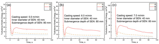 Effect of casting speed on turbulent kinetic energy at the mold’s liquid level. (a) 5.0 m/min; (b) 6.0 m/min; (c) 7.0 m/min.