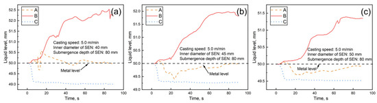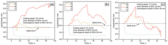 Effect of casting speeds on the mold’s liquid level. (a) 5.0 m/min; (b) 6.0 m/min; (c) 7.0 m/min.
