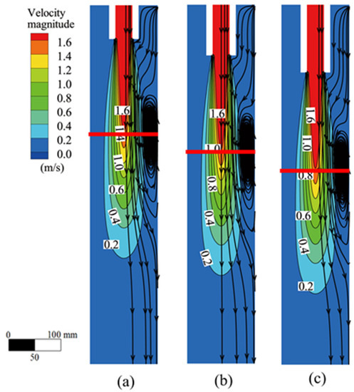 The SEN immersion depth was also an important factor in determining the flow field of molten steel. The flow field at different immersion depths when the casting speed was 5.0 m/min and the inner diameter of the SEN was 40 mm is shown in Figure 7; the red horizontal line in the figure shows the position of the raceway center. An increase in the SEN immersion depth led to the overall downward movement of the high-velocity region, resulting in the downward movement of the impact depth and the raceway center position. However, there were no changes to the flow velocity of molten steel at the SEN outlet as there were for flow field characteristics. Once entering the mold, the jet impinged towards the bottom. Then, the weaker stream diverged towards the wall and flipped upward along the wall for backflow movement. The size of the raceway at different immersion depths was substantially homologous.