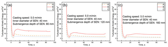 Effect of immersion depth on the turbulent kinetic energy of a mold’s liquid level. (a) 80 mm; (b) 120 mm; (c) 160 mm.