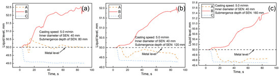 Effect of immersion depth on the mold’s liquid level. (a) 80 mm; (b) 120 mm; (c) 160 mm.