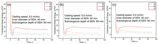 Effect of inner diameter on turbulent kinetic energy of the mold’s liquid level. (a) 40 mm; (b) 45 mm; (c) 50 mm.