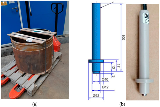 The tubing to be used as a receptor for the canisters was made of carbon steel (Figure 2a), the chemical composition of which is given in Table 1. This tubing was reprocessed for designing and constructing the API 5L X65 carbon steel electrodes (Figure 2b) to be used for the corrosion studies. The electrode body (diameter 12 mm) was in polyether ether ketone (PEEK). Robust sealing was ensured by two o-rings to prevent any crevice corrosion. The design and production was based on ten years of experience [31]. The exposed metal was a cylinder 5 mm in diameter and 3 mm in height, for a total exposed surface (lateral and one basal) of 0.64 cm2.