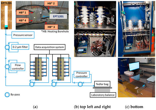 (a) Schematic representation of the device within the Andra URL (Bure, France), showing the circuit for supplying Cox pore water to the two multi-parametric probe holders (MPPs). (b) top left and right. Cupboard (dimensions: 90 × 50 × 200 cm) with two MPPs and instruments (computer, DAS, pH meters, flow controller, and precision balance connected to DAS). (c) Bottom. Outside of the cupboard of (b), a potentiostat–galvanostat impedance meter.
