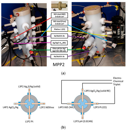 (a) Two views of the same MPP-2 with an electrochemical triplet, its electrodes positioned in the same plateau (P3) at a central level of the MPP-2. (b) Left: Plateau P2 with schematic representation of the doublets for monitoring the OCP of X65free (L2P2), Ag2S/Ag (L3P2), and Pt (L1P2) vs. AgCl(s)4)/Ag (L4P2). Right: Plateau P3 with schematic representation of the pH commercial electrode and the electrochemical triplet connected to the potentiostat–galvanostat for corrosion monitoring.